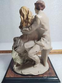 Questa elegante statuetta in porcellana Capodimonte raffigura una coppia in un momento di dolce intimità. La figura femminile, seduta, tiene in mano un piccolo bouquet di fiori, mentre la figura maschile le è amorevolmente accanto.