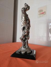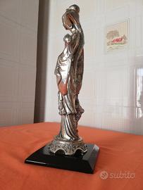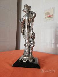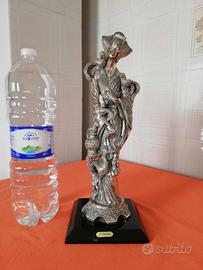 L'oggetto raffigura una donna, la rappresentazione artistica di una dama cinese o una geisha in abiti tradizionali oppure una divinità come Guanyin. Si tratta di una scultura di ispirazione sino-giapponese, realizzata in bronzo o ghisa, sicuramente in 'bagna d'argento' su base scura. Queste figure sono caratterizzate da abiti ampi con panneggi fluidi, acconciature elaborate e spesso accompagnate da elementi simbolici come fiori, uccelli o piccoli vasi. Statue di questo tipo erano popolari come oggetti decorativi nel XX secolo, con molti esemplari risalenti agli anni'50, '60 o' 70. MISURE: Altezza 40 Peso 1,8 kg Base 'Garsia' 15X15