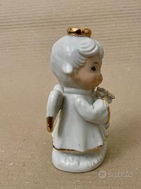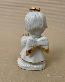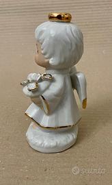Incantevole statuetta vintage in porcellana Capodimonte raffigurante un giovane angelo con in mano un mazzo di fiori. Finemente realizzata a mano in Italia, questa scultura è decorata con delicati dettagli dipinti a mano e rifiniture in oro 24K sull’aureola, le ali e i bordi della veste. Un oggetto decorativo da collezione che rappresenta al meglio l’arte della porcellana Capodimonte, ideale per collezionisti o come raffinato elemento d’arredo.