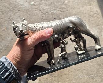 Statuetta che raffigura il mito della fondazione della città: la lupa che allatta i gemelli Romolo e Remo dopo che furono abbandonati sulle sponde del Tevere. È un oggetto d'arte decorativa o un souvenir di lusso prodotto da una fonderia artistica italiana (molto probabilmente romana). Questi oggetti venivano spesso regalati come premi istituzionali o acquistati dai turisti colti che visitavano la capitale.
