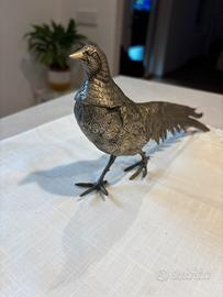 Splendida scultura vintage raffigurante un fagiano, realizzata in metallo pesante con finitura argentata (probabilmente bronzo argentato o peltro). L'oggetto si distingue per l'altissima qualità del dettaglio, con un piumaggio finemente cesellato e una lunga coda testurizzata che dona dinamismo alla figura.