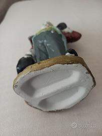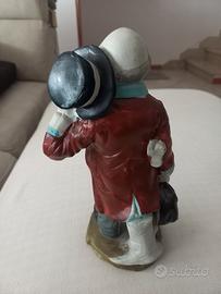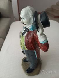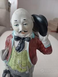 Splendida statuetta decorativa d’epoca realizzata in porcellana biscuit dipinta a mano con finitura opaca. La figura ritrae un elegante gentiluomo o uomo d'affari in abiti vittoriani/edoardiani. Giacca bordeaux, gilet verde a righe con catenina da orologio da taschino, papillon nero e l'immancabile cappello a cilindro sollevato in segno di saluto. Il personaggio tiene una borsa/valigetta in una mano e un giornale sottobraccio, dettagli che conferiscono carattere e una storia al pezzo. Dimensioni: Altezza circa 22 cm, base di circa 8 cm. L'oggetto è in buone condizioni vintage. La vernice presenta la patina del tempo che ne autentica l'età (piccole mancanze di colore tipiche del biscuit, come visibile in foto, che non ne pregiudicano il fascino. Massima cura nell'imballaggio. #porcellana #vintage #statuetta #biscuit #collezionismo #antiquariato #gentiluomo #vittoriano #decorazionecasa #soprammobile #porcellanadipinta #figurina