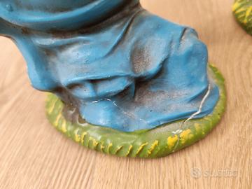 statuette della Madonna e San Giuseppe in Cartapesta realizzati in Italia da Marchi, altezza circa 23 cm. La statuetta della Madonna ha delle lesioni sulla base sia sulla parte anteriore dove manca un triangolino che nella parte posteriore dove mancano dei pezzettini però inserite all'interno di un presepe tra il muschio questo difettonon si dovrebbe notare San Giuseppe invece non ha difetti a parte degli scorolimenti sul mantello sempre nella parte posteriore. Sono disponibile a mandare altre foto per valutare meglio lo stato degli oggetti.Sono articoli rari, perché fatti in Italia.