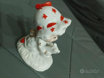 Deliziosa statuina in ceramica raffigurante una bambolina con un gatto. - Dettagli dipinti a mano. - Cappello con decorazioni rosse. - Anello dorato al dito. Altezza 7 cm circa