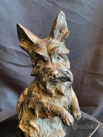 Carmelo Ganci, operativo a Milano, 1930-1950 scultura in terracotta di un cane Terrier placcata argento con tecnica a bagno galvanico, basamento in legno nero. Misure h 18 x l 17 x p 7 cm. Buono stato con evidenti segni di usura della placcatura.