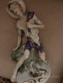 Statuina in ceramica vintage raffigurante un giovane pescatore con cappello e decorazioni dipinte in oro , colori tenui… oggetto molto decorativo ed elegante, nuovo senza cartellino