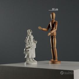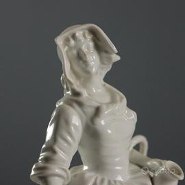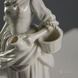 Statuina in porcellana bianca raffigurante figura femminile con orcio e cestino.