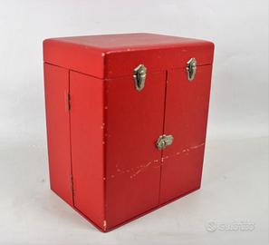 Corredata di confezione bauletto apribile, in legno e raso rosso, con chiusure a vista.