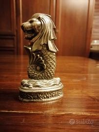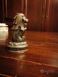 Splendida riproduzione del Merlion, il leggendario simbolo di Singapore con testa di leone e corpo di pesce. La statuina è realizzata in metallo pesante con una bellissima finitura vintage effetto bronzo/argento invecchiato.