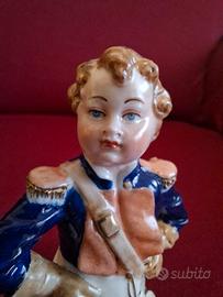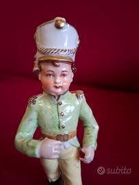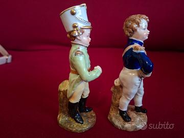 coppia di mascotte del periodo napoleonico dell'esercito inglese o francese, che usavano i bambini con uniforme militare in rappresentanza dei vari reggimento. altezza 12.5 larghezza 5.5 profondità 5.7 . una ha la punta ed il manico della spada scheggiato l'altra la piuma sul cappello rotta ma comunque bellissime pe la loro epoca
