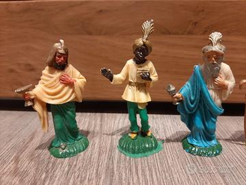 Statuine rappresentanti alcuni personaggi del presepe come i Re Magi, San Giuseppe e la Madonna, vintage (anni '70) in plastica realizzati dalla ditta italiana Nardi.