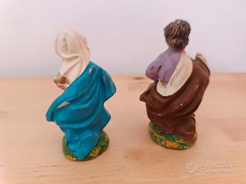 Statuine del presepe raffiguranti Maria e Giuseppe. Sono in buone condizioni, mostrano solo qualche segno del tempo,ma è pur vero che di anni ne hanno un bel po'.