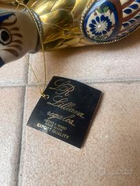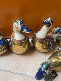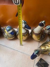 Queste sono statuette da collezione raffiguranti anatre, note come Mexican Tonala Pottery & Brass Duck Figurines. Materiali: Sono realizzate combinando ceramica dipinta a mano (tipica della zona di Tonalá, Messico) e ottone o rame. Stile: Queste figure decorative mescolano l'arte popolare messicana con rivestimenti metallici, molto popolari come oggetti vintage o di metà secolo. Dettagli: Ogni anatra presenta decorazioni uniche dipinte a mano sulla testa e sulle ali in ceramica, mentre il corpo è rivestito in metallo lucido. Queste sono informazioni che ho trovato su internet qualcuna ha ancora il cartellino. Hanno qualche segno di usura è impolverate ma sono in ottime condizioni. Per maggiori info mi scrivete in privato