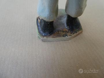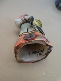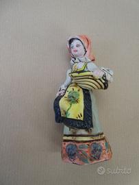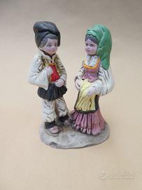 Statuine vintage anni 60-70 di A. Massidda Cagliari in ceramica completamente lavorata e dipinta a mano, rappresentanti personaggi della cultura sarda. Gruppo di 3 statuine di altezza circa 12 centimetri: musicista, donna con corbula, coppia in costume tradizionale. Condizioni generali buone come da foto, con piccole sbeccature facilmente restaurabili.