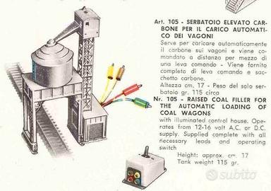 Vendo stazione rifornimento carbone per carri tramoggia Pocher art.105 del 1960, molto rara, dimensioni 100x45x170mm circa. La stazione è priva del silos, visibile nel catalogo che ho allegato come immagine, che andrebbe eventualmente ricostruito. Ho altri vagoni, locomotive e accessori per fermodellismo scala H0 vintage, sconti per acquisti multipli, gli altri oggetti (Lima, Pocher, Rivarossi) li vedete nelle ultime immagini Spedizione disponibile, o anche ritiro diretto gratuito in zona Milano Est (Pessano - Carugate - Cologno Monzese) Contattatemi per info e per creare un annuncio dedicato coi pezzi che volete e ulteriori foto.