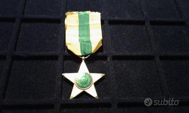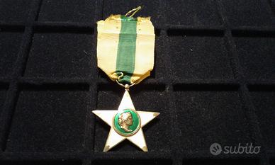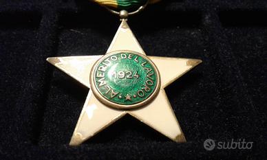 Bellissima decorazione "Stella al Merito del Lavoro del 1924", le origini della decorazione risalgono al R.D. 1º maggio 1898, n. 195. Il re Umberto I istituì una "Decorazione del merito agrario ed industriale" per gli imprenditori agricoli e industriali e una "medaglia d'onore" per i loro dipendenti. Con il R.D. 9 maggio 1901, n. 168, il re Vittorio Emanuele III trasformò questa decorazione nell'"Ordine cavalleresco al merito agrario, industriale e commerciale". L'onorificenza poteva essere conferita anche ai dipendenti operai (art. 2, c. d). Nel 1923 l'ordine, che nel frattempo aveva mutato denominazione in "Ordine al merito del lavoro", venne sdoppiato. Il R.D. 30 dicembre 1923, n. 3031, restrinse l'accesso all'ordine ai soli imprenditori e, contemporaneamente, il R.D. 30 dicembre 1923, n. 3167, istituì per i lavoratori la Stella al merito del lavoro che da allora ebbe vita autonoma. Questa decorazione, con il tipo immodificato, è stata assegnata anche durante il periodo della Repubblica Italiana. La decorazione consiste in «una stella a cinque punte in smalto bianco; il centro è in smalto color verde chiaro e reca sulla faccia diritta un rilievo in argento dorato, raffigurante la testa d'Italia Turrita e sul rovescio la scritta AL MERITO DEL LAVORO con l'indicazione dell'anno di fondazione (1924)» con il nastrino tricolore giallo-verde-giallo della lunghezza di 120 mm in piega coeva di 60mm . È conforme al disegno araldico annesso al R.D. 25 gennaio 1925, n. 120.