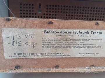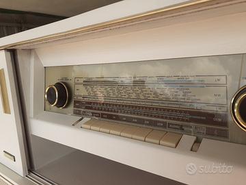 ..imponente stereo anni 60 made in Germany..by Grundig ,appena restaurato elettricamente,sia radio che piatto giradischi,mobile riverniciato da marrone in origine a bianco( vedi foto),sostituzione altoparlanti...circuito valvolare:ecc85,ech81,eaf801,ecl86,em87-Om,OL,OC,FM...chiaramente FUNZIONANTE.Possibilita' di consegna in regione con n.s.corriere(costo extra).Per info,foto,video funzionamento contattare ESCLUSIVAMENTE mio n.whatsapp 3289190037.SCONTO SOLO PER RITIRO presso n.s. sede.