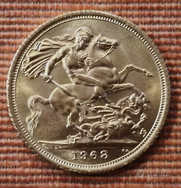 Sterlina d’oro inglese anno 1968, con Elisabetta II e San Giorgio che uccide il drago. Moneta autentica e originale✔ Ottimo stato generale (vedi foto) tenuta all'interno della sua confezione (no graffi) Ideale come investimento in oro o per collezionisti. 📍 Consegna a mano