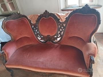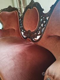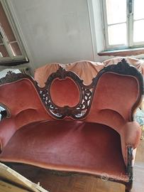 Questo è un divano antico in stile vittoriano con rivestimento in velluto rosa antico.
