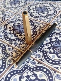 Penna stilografica Aurora, usata poco ma molto ben tenuta, Fa parte della collezione "Archivi Storici": corpo in resina, cappuccio satinato oro, rifinitura "Gold brushed", pennino carenato.
