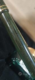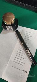 Corpo in ebanite verde/nero, dettagli dorati, pennino in oro 18kt. lunghezza 14cm. completa di scatola originale esternamente segnata dal tempo, boccetta inchiostro verde originale e libretto delle istruzioni. Mai caricata.