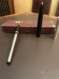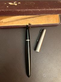 Bellissima penna stilografica d'epoca, Parker 51, corpo di colore nero con cappuccio color argento e gemma sul top, e pennino coperto, caricamento sackless filler speedline