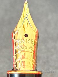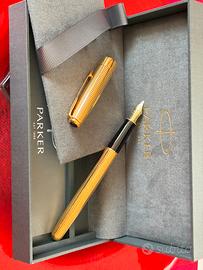 Parker Sonnet laminata Oro. Splendida penna stilografica nuova NOS Parker Sonnet Laminata in oro. Stilografica stupenda e mai usata, non é mai stata inchiostrata. Pennino in Oro 18 kt. 750 con un tratto Extra Fine molto molto scorrevole. La penna non ha il minimo segno e viene venduta con la sua confezione che include il converter