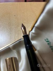 Penna stilografica Pelikan 500NN nera con inserti in celluloide verde trasparente, pennino originale Pelikan 585 in oro 14 carati, misura KEF, cappuccio in oro laminato. La penna viene fornita con scatola originale.