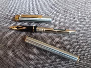 Penna stilografica Sheaffer Targa serie 4 in acciaio satinato, prodotta durante gli anni 80.