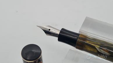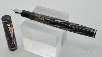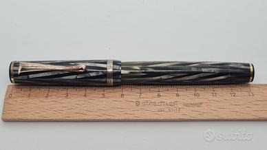 Ben conservata. Celluloide striata grigio-verde. Clip e rifiniture esterne in metallo dorato ( probabilmente in ottone). Pennino in acciaio originale Stilnova Extra. Sistema di ricarica a stantuffo funzionante anche se consiglio una revisione della tenuta del sughero. Lunghezza con cappuccio chiuso 13 cm. Stilnova è un marchio italiano dell'azienda Pagliero di Settimo Torinese TO che produceva questo modello tra gli anni '40 e '50.