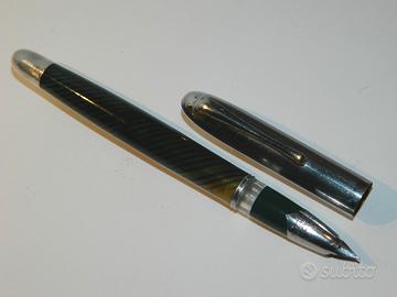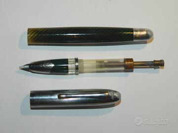 Stilografica Hurricane made in Italy anni 60, corpo in celluloide verde trasparente, tappo in metallo a pressione, finiture cromate. Pennino semicoperto in acciaio misura #EF (Exstra Fine) caricamento a pistone. La stilografica è funzionante, piccoli segni d'uso.
