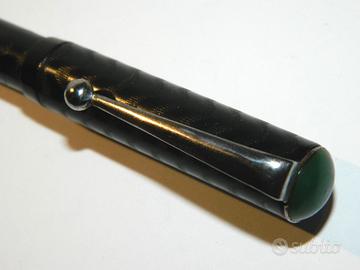 Rarissima stilografica IDEAL dei primi del 900 del secolo scorso. Corpo e tappo in ebanite nera cesellata, con clip in acciaio, inserto verde colore Giada sul tappo, pennino in acciaio misura F (Fine), incisione IDEAL sul barile. Lunghezza della stilografica Cm. 12,5 diametro del barile Cm. 1,5 sistema di caricamento Eyedropper Filler. Stilografica di assoluta rarità, un vero pezzo da collezione. Stilografica ben conservata nessun danno visibile, perfettamente funzionante.
