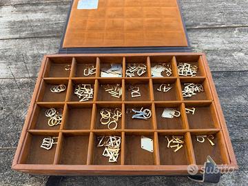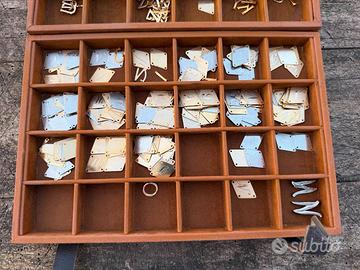 Splendido lotto di minuteria metallica, vero e proprio fondo di magazzino di una merceria degli anni '90. Si tratta di materiale vintage originale, mai usato e in ottime condizioni. L'assortimento è suddiviso tra: Lettere singole sagomate a rilievo Targhette metalliche lisce o con iniziali elegantemente incise in corsivo I pezzi presentano finiture lucide e satinate nei toni classici dell'oro e dell'argento. Tutto il materiale è custodito e già organizzato all'interno di due comodi espositori a scomparti (visibili in foto), ideali sia per mantenere l'ordine nel proprio laboratorio, sia per l'esposizione al pubblico in fiere e mercatini. Materiale perfetto per: Personalizzazione di articoli in pelle, cinture e borse Creazione di gioielli e bijoux artigianali Progetti fai-da-te, scrapbooking e hobbistica Restauro di accessori d'epoca Contattatemi per maggiori informazioni o dettagli.