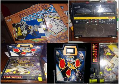 Inoltre: videomicroscope Max ottimo stato anni 80 lasciato funzionante coi suoi componenti e strumenti e all’interno della sua scatola originale; flipper in ottime condizioni lasciato funzionante, dei primi anni 90 Star Fighter Arcade Electronic LCD Pinball da tavolo elettronico portatile con luci e suoni a tema spaziale, tabellone segna punti, luci e suoni, interruttore on/off, elettronico con schermo lcd che tiene conto dei punti in automatico, pulsante accendi/spegni e reset; storici videogiochi console Xbox 360 e console Game Player Console dei primi anni 90 con un joystick vintage incluso..X box360 col proprio lettore cd dvd rom drive e della ventolina..probabilmente funzionanti ma non essendo esperto li cedo come non funzionanti per collezionismo o riutilizzo, per rivendita, ricambi ecc; svariati manuali fascicoli garanzia della Nintendo; stereo karaoke AM/FM anni 90, casse incorporate, phones, 2 piastre musicassetta, possibilità di registrazione e karaoke, portamicrofono incorporato microfono disponibile, da verificare.