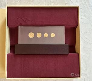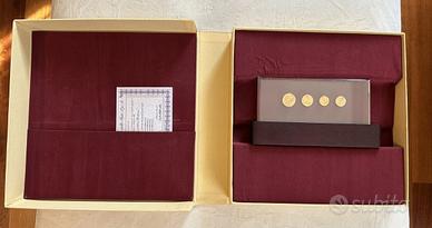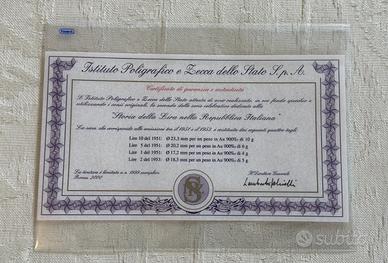 REPUBBLICA ITALIANA (1946-) La storia della Lira - Riconi delle monete da 10 Lire 1951, 5 Lire 1951, 2 Lire 1953, Lira 1951 - AU (g 25 in totale titolo 900) Lotto di cinque riproduzioni inserite in una elegantissima confezione dedicata della Sipleda Edizioni d'Arte 32 x 32 cm, con certificato dell'IPZS