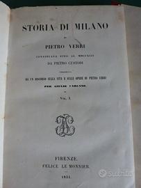 Storia di Milano di Pietro Verri 1851 edizione Felice Le Monnier Firenze, opera in due volumi con copertina rigida, formato 12x18 cm, pagine del vol.1 455, pagine del vol.2 495, condizioni generali buone con segni di ingiallimento e alcune pagine danneggiate ma tutte leggibili, il vol.1 contiene la piantina di Milano perfettamente integra, posso spedire.