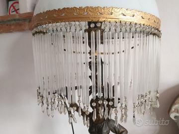Una sofisticata lampada da tavolo Art Nouveau con allegoria dell’agricoltura, lampada in bronzo, con base in alabastro verde chiaro. La cappella, in vetro lattimo, presenta una cornice di pive in vetro di Murano magistralmente composta, vetro color ghiaccio. L'oggetto è di manifattura italiana. L’insieme, di grande valore artistico, rappresenta il gusto per le arti di fine 1800.