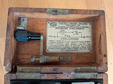 Strumento elettrico per prova isolamento line e/o cavi, cassa in legno, cintura in cuoio, manovella per azionare il generatore, tutto originale, nella cassa di legno lato posteriore in alto è mancante un pezzetto di legno come da foto, qualche piccolo segno del tempo. Oggetto ideale per collezionisti, mostre, sopramobile ecc. Funzionante, ma ormai superato dalle attuali apparecchiature elettroniche.