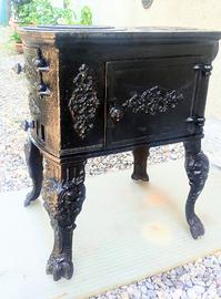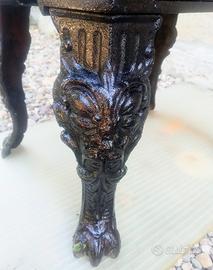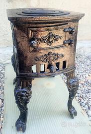 bellissima stufa a legna in ghisa finemente lavorata su tre dei quattro lati con decori floreale e gambe con testa leonina ....provenienza dalle trincee dell adamello della 2 guerra mondiale : reparto ufficiali e.o di comando .... e quindi anni 40 ......doppio ripiano per cottura alimenti , vaschetta tienicaldo vivande o gavette .....tubo esalazione fumi diametro cm 9 . dimensioni cm 45 x 30 altezza cm 55 .