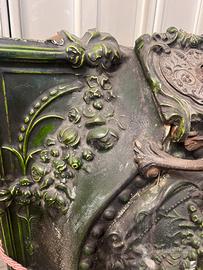 Si tratta di una stufa d'epoca in ghisa smaltata, un modello Art Nouveau (stile Liberty) della marca "Deville".