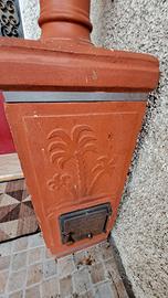 Prodotta in Toscana tra gli anni 1930 e 1950, modello medio, completamente in materiale refrattario con decorazioni a rilievo. completa di canna fumaria in terracotta.