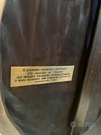 Tecnica: Bassorilievo in bronzo a cera persa con rifinitura a cesello e patinatura a fuoco eseguite e mano Da sempre la figura umana è stata al centro della ricerca artistica. Fin dall’età classica la resa naturalistica dell’anatomia umana è stata uno degli obiettivi principali di pittori e scultori di tutti tempi. La rappresentazione del nudo è la massima espressione di questa aspirazione, trasversale a tutte le epoche e a tutte le correnti stilistiche. Infatti oltre alle interpretazioni naturalistiche, proprie del Rinascimento e dei vari classicismi, che mirano ad una rappresentazione veritiera e dettagliata del corpo umano, il nudo è stato protagonista anche all’interno delle nuove concezioni estetiche portate dalle avanguardie storiche, come nel Cubismo, nell’Espressionismo e nel Surrealismo. Quest’opera di Alexander Kossuth si ispira al celebre soggetto della “Nascita di Venere”. L’origine della dea della bellezza, da una conchiglia trasportata dalle onde del mare, è stata immortalata in opere famosissime come quella di Sandro Botticelli. Wolfgang Alexander Kossuth è un artista di origine tedesca nato a Prfonten nel 1947. Personalità eclettica ha dedicato tutta la sua vita all’arte, non solo tramite la scultura, ma anche attraverso la musica, la letteratura e la danza. La figura umana è sempre al centro della sua ricerca, in un’interpretazione fondamentalmente molto naturale e armonica che guarda all’arte classica
