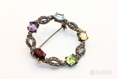 Stupenda spilla circolare Art Deco realizzata in argento, ornata da scintillanti marcasiti e cinque pietre preziose ovali di diversi colori: un'ametista viola, un'acquamarina azzurra, un citrino giallo, un peridoto verde e un granato rosso. Il diametro della spilla è di 36 mm.
