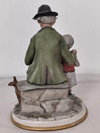 Artistica e dolcissima grande statua Capodimonte d'epoca molto particolareggiata nei suoi minuziosi dettagli (vedi foto annuncio) risalente agli anni '40/'50 raffigurante un nonno, con una pipa tra le mani, seduto su una panchina con accanto la sua amata nipotina dai lineamenti dolcissimi intenti a guardare razzolare una gallina il cui piatto con i semi è posizionato ai piedi della bimba. Stupenda anche la base della statua realizzata con una greca in oro (vedi foto annuncio).
