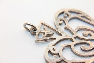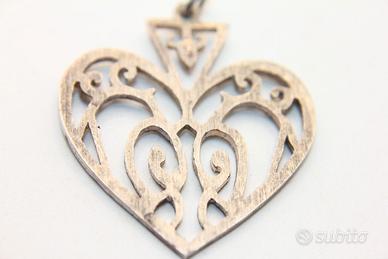 Questo gioiello è un piccolo capolavoro di design traforato, dove eleganti intrecci e spirali di ispirazione celtica si uniscono per disegnare la forma romantica di un cuore. La sua lavorazione minuziosa crea un meraviglioso gioco di pieni e vuoti che dona leggerezza e profondità al pendente, catturando lo sguardo e la luce. Realizzato in argento con una finitura che ne esalta i dettagli, misura 33 x 27 mm, una dimensione ideale per renderlo protagonista del tuo stile senza essere eccessivo.