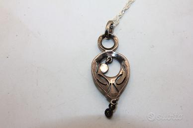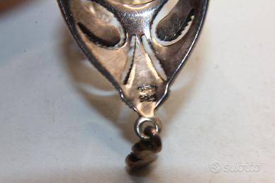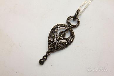 Questo splendido collier incarna perfettamente il gusto ricercato del periodo Art Déco, combinando una struttura architettonica a un’eleganza senza tempo. Il pendente presenta una raffinata forma a goccia traforata, impreziosita da una cascata di lucenti pietre di marcasite incastonate a mano che donano al gioiello un caratteristico scintillio metallico, tipico dell’epoca. Il design è caratterizzato da una complessa lavorazione a sbalzo con motivi floreali e geometrici stilizzati, arricchito da un elemento centrale mobile e da un delicato pendente finale che conferisce dinamismo e grazia a ogni movimento. La montatura è realizzata in argento 925, come confermato dai punzoni visibili sul retro, che garantiscono la qualità del metallo e la cura artigianale della manifattura. Con le sue dimensioni generose di 47 x 18 mm, questo pezzo rappresenta un accessorio di grande carattere, ideale per chi ama il fascino del gioiello d'antiquariato e desidera un tocco di luce sofisticata e discreta.