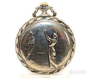 Questo stupendo orologio da tasca in stile Art Nouveau risalente alla fine del 1800 è realizzato in argentan e si presenta con una cassa di generose dimensioni dal diametro di 51 mm che ne esalta la presenza scenica. La superficie esterna è finemente lavorata con le tipiche linee sinuose e i motivi ornamentali caratteristici del periodo che conferiscono all'oggetto un fascino artistico inconfondibile e una piacevole sensazione tattile. Il quadrante d'epoca conserva tutto il prestigio del design originale dell'epoca e testimonia la cura artigianale impiegata nella sua creazione per garantire un'estetica armoniosa e raffinata. Sebbene il meccanismo risulti ancora oggi funzionante a testimonianza della sua robusta costruzione storica la veneranda età dell'orologio rende consigliabile una revisione tecnica specializzata per preservarne al meglio la precisione e il corretto movimento nel tempo. Questo pezzo rappresenta un'opportunità unica per i collezionisti di possedere un autentico frammento di storia dell'orologeria europea caratterizzato da una patina naturale che ne sottolinea l'autenticità e il valore decorativo.
