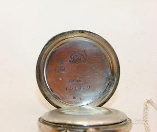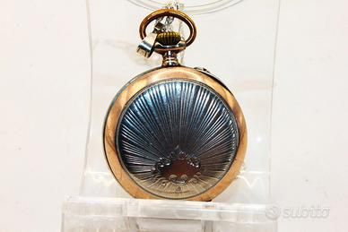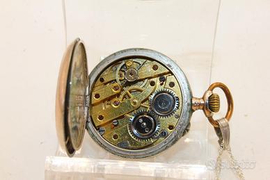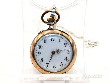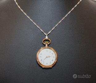 Elegante orologio da collo della fine del 1800 caratterizzato da una raffinata cassa in argento impreziosita da profili in oro sui fianchi. Il quadrante in smalto bianco presenta classici numeri arabi e minuteria perlata dorata completato da lancette finemente lavorate. Il retro è decorato con un pregiato motivo a raggiera inciso che converge verso uno scudo centrale personalizzabile. Con un diametro di 30 mm e un peso di 22 grammi questo gioiello d'epoca unisce la precisione meccanica del passato a un'estetica intramontabile perfetto da indossare come ciondolo grazie alla sua catena coordinata. Funzionante