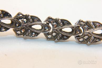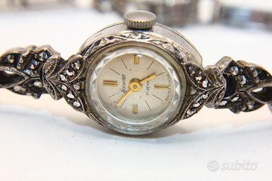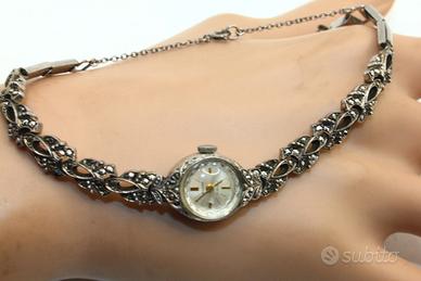 Questo orologio da polso vintage per signora, risalente agli anni '60, è un vero e proprio gioiello dell'oreficeria. Realizzato interamente in argento 925, il bracciale e la cassa sono impreziositi da una ricca pavimentazione di marcasite. Il peso complessivo di 21,3 grammi e le dimensioni contenute lo rendono un accessorio comodo da indossare e di grande effetto. Un segnatempo elegante e funzionale, perfetto per completare un look sofisticato.