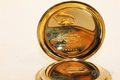 Questo stupendo orologio savonette degli anni '30 rappresenta un esempio magistrale di orologeria d'epoca, caratterizzato da una raffinata cassa Gold Double che emana un fascino senza tempo. Il quadrante dorato è impreziosito da un sofisticato motivo a scacchi testurizzato, sul quale risaltano eleganti numeri arabi applicati e lancette lavorate con estrema cura, completato da un sotto-quadrante per i secondi a ore sei che ne sottolinea la precisione tecnica. La cassa esterna esibisce una splendida lavorazione guilloché con decorazioni geometriche a rombi, mentre l'interno del coperchio rivela punzonature di qualità che certificano una placcatura di 20 micron garantita per dieci anni, a testimonianza della robustezza e del pregio della manifattura. Con un diametro imponente di 53 mm e un peso solido di 83,7 grammi, l'orologio custodisce un affidabile movimento svizzero, sinonimo di eccellenza e durata nel tempo. Ogni dettaglio, dalla corona di carica finemente zigrinata all'anello di sospensione decorato, riflette l'attenzione ai particolari tipica della produzione di alta gamma dell'inizio del ventesimo secolo. L'oggetto è accompagnato dalla sua custodia originale in pelle marrone con cuciture a vista, che non solo ne ha preservato lo stato di conservazione ottimale, ma aggiunge un ulteriore tocco di autenticità storica a questo straordinario pezzo da collezione.